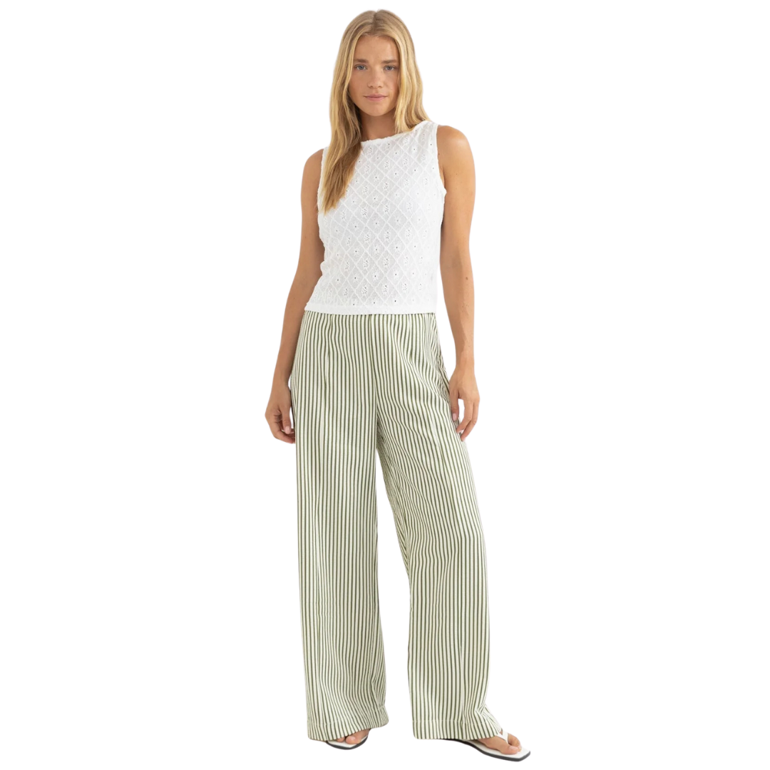 Crafted from a soft fabric, these high-waist pants in aloe feature a fixed waistband and an extra wide leg design for a relaxed, flowing silhouette. The panel lines through the front and back legs, along with a side seam invisible zip closure, add a modern touch, with a size 8 out seam of 106.5cm.