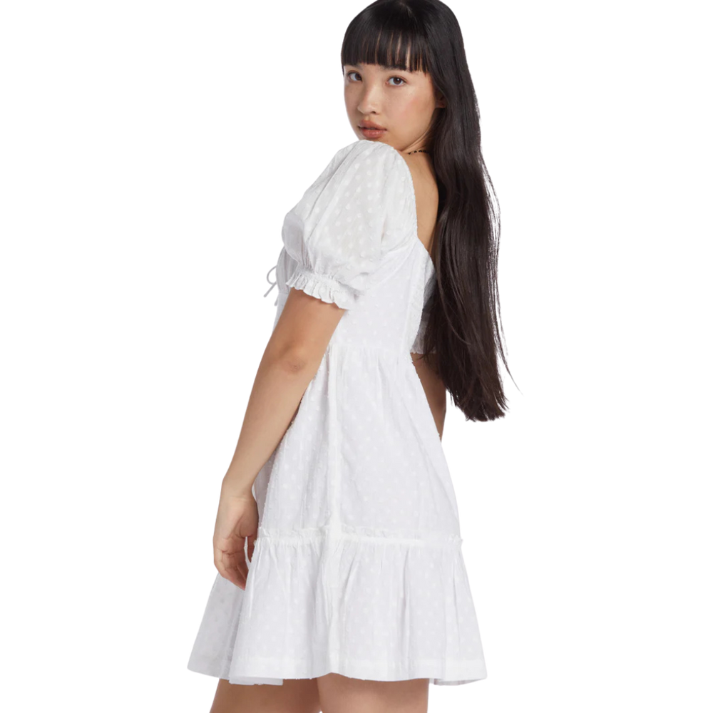 With its cute puff sleeves, ruched bust, fitted waist and tiered skirt, the Venie Daydream mini dress from ROXY's Chloe Kim Signature Collection has all the pretty details. Crafted of cotton swiss dot fabric for dreamy texture, this playful mini is a perfect look for your next warm-weather rendezvous.