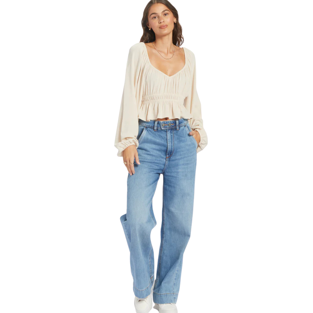 Add a feminine touch to your everyday look with the Cool Winds long-sleeve top. Crafted of eco-conscious viscose fabric for a soft and lightweight feel, this playful top combines long blouson sleeves, a wide V-neck, a fitted bodice with gathering details and a cute hem ruffle. Pair it with jeans for effortlessly romantic everyday look