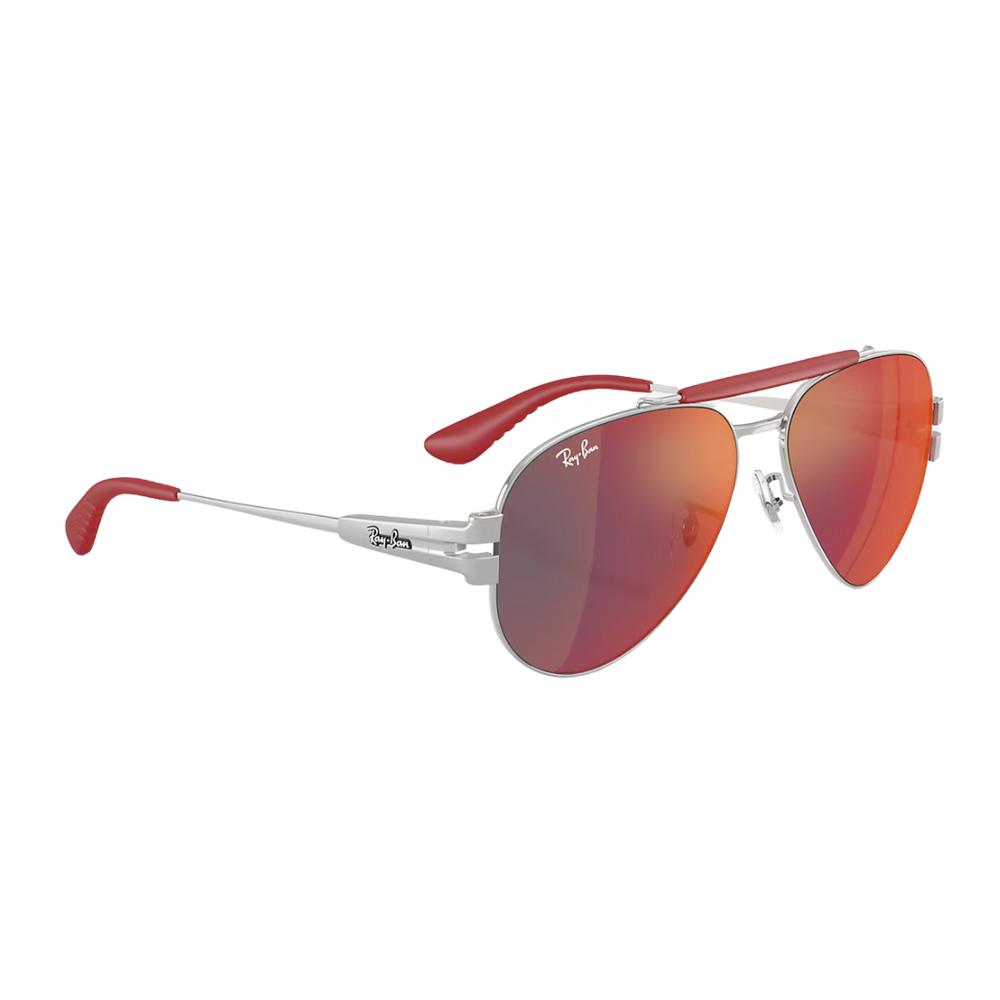 Ray-Ban RB3762M Scuderia Ferrari Collection Phantos sunglasses are a must-have for any racing enthusiast. The distinct phantos frame shape, combined with the metal frame in polished silver, features the iconic Ferrari shield on the temples. Paired with the dark grey mirror blue/red lenses, these sunglasses not only express sporty style, but also showcase your love for speed and performance, whether you're at the track or just out and about.