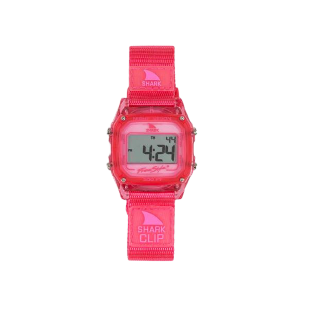 Indulge in vibrant summer vibes with the Cherry Shark Clip Watch from Freestyle's new Jelly Bean Collection. Featuring a transparent red case and a bold Cherry-colored Shark Clip strap with our new signature see-through patches, this watch is a must-have for your sunny escapades. Whether you're surfing the waves or chilling by the poolside, its water resistance up to 300ft and secure Shark Clip closure ensure durability and comfort. Stay organized with digital precision using features such as stopwatch, timer, and alarm, and illuminate your evenings with its convenient backlight. Perfect for collectors and summer enthusiasts alike, the Cherry Shark Clip Watch combines functionality with fashion to elevate your seasonal style.