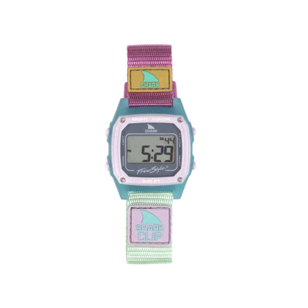 Dive into summer vibes with Shark Watch Chillin from Freestyle Watches' Beach Life collection. Serene seafoam green and tranquil purples capture the carefree spirit of sun-kissed days. Its frosted, semi-transparent case mimics the smooth texture of sea glass while packing a digital powerhouse to keep you organized for endless escapades.