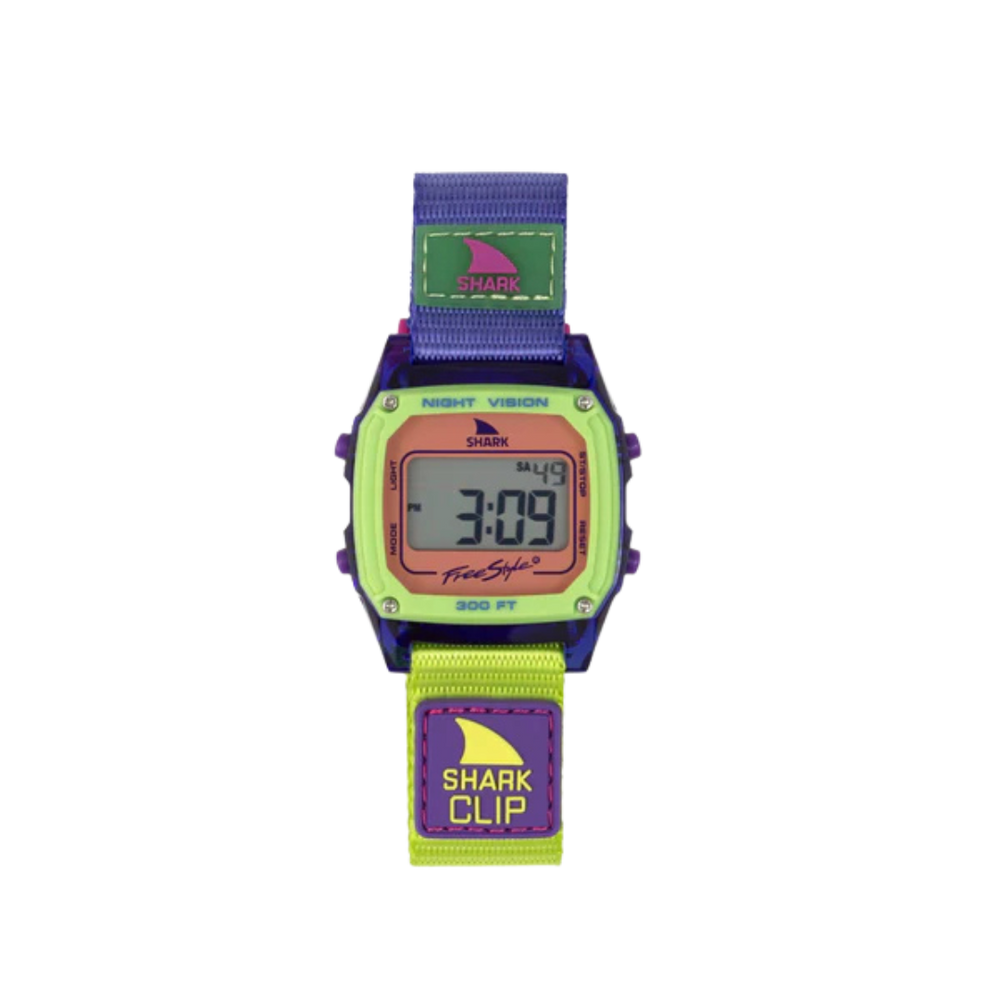 Shark Clip Coastal Heat brings the party to your wrist with a clear blue case and a bold mix of neons, bright color-blocking, and retro-inspired design that feels like wearing a beach sunset. This throwback digital watch delivers serious 90s style with a modern twist.