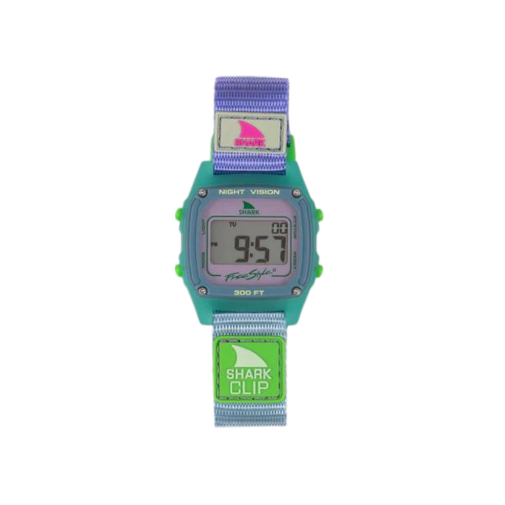 Shark Clip proudly showcases the iconic OG clip band system that turned Freestyle into a legend. Picture it like sliding into a comfy seatbelt – a simple clip and you're snug and secure. But don't be fooled by its rad appearance; this surf watch isn't just about style – it's loaded with all the digital must-haves: time, date, stopwatch, countdown timer, alarm, and even a night vision backlight. Plus, you've got the reassurance of our reliable limited lifetime warranty. Oh, and when you're catching those waves, no worries – it's water-resistant up to 100 meters deep. Surf's up!