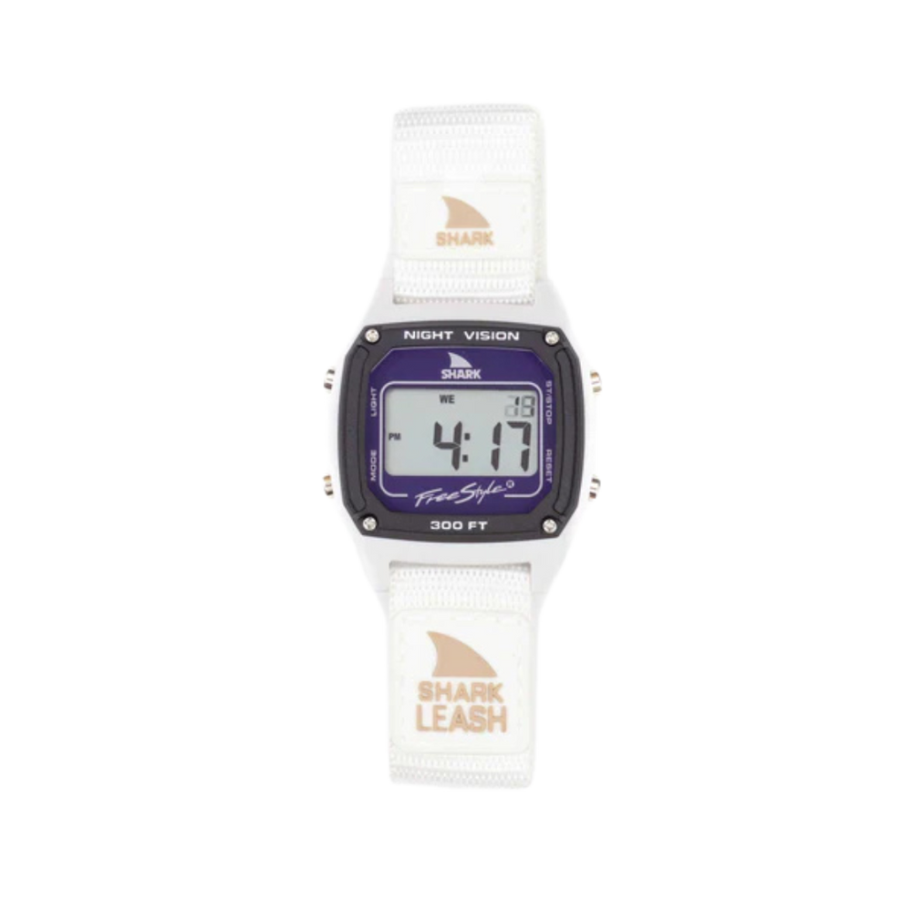 They're Back. The original Leash band that ignited Freestyle Watches in the late '80s is back and better than ever. The shark leash's hook and loop closure system is modeled after an '80s style surfboard leash, and is ready to get radical. The Shark Leash comes loaded with standard digital features like time, date, stopwatch, countdown timer, alarm and night vision backlight. Like all Freestyle Watches, The Shark Leash is water resistant to 100 Meters and backed by our limited lifetime warranty. Shark to the Future!