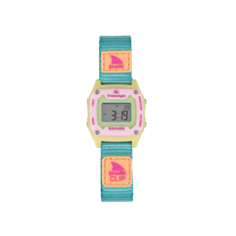 Shark Mini Fizzberry looks good enough to unwrap. This pastel digital watch layers soft lemon, candy pink, and bright aqua with sweet hits of peach and neon pink - like your favorite boardwalk treat, now in watch form. Same retro-inspired design, just sized down for smaller wrists.