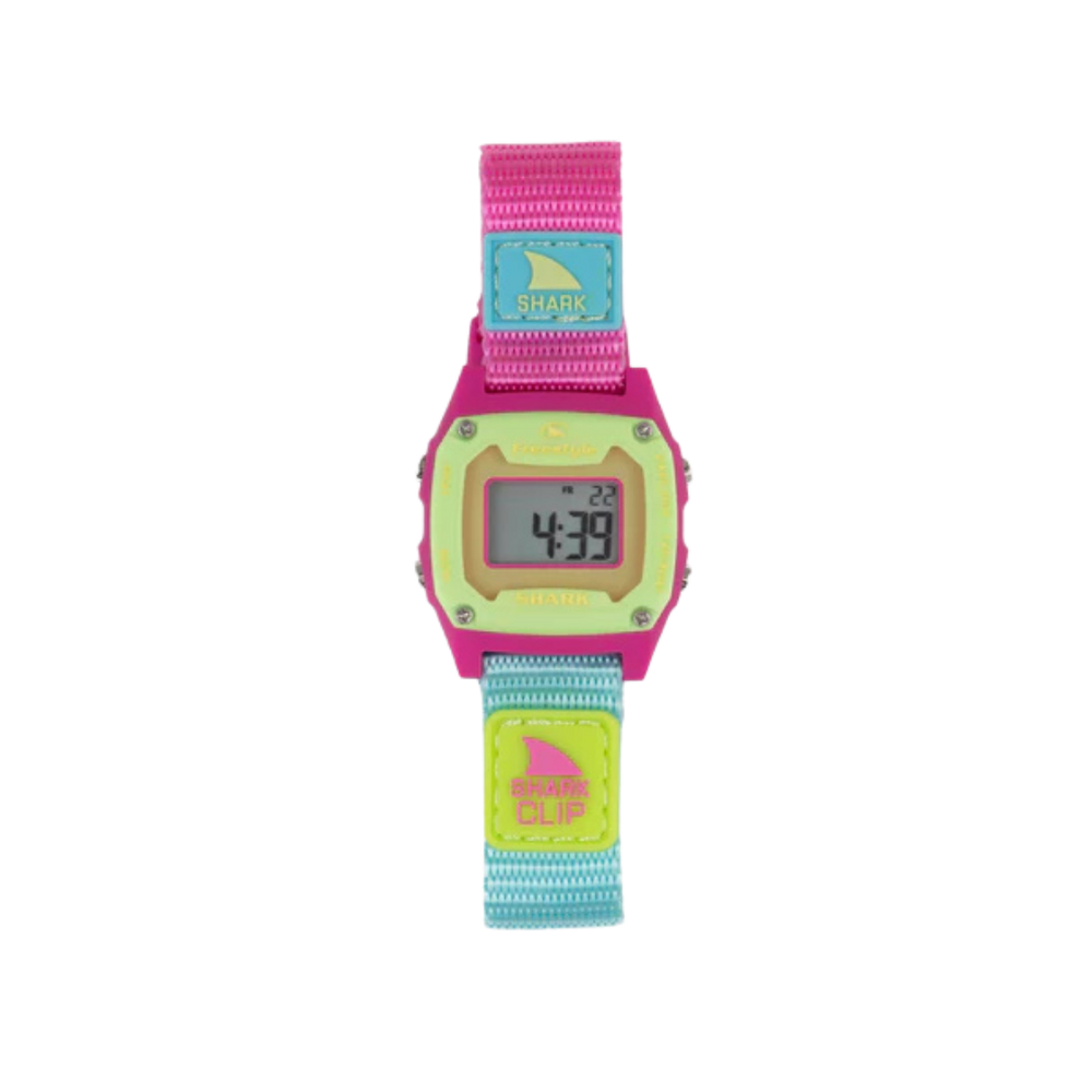Bringing the flavors of endless summer to your wrist, the Shark Mini Clip Popsicle combines neon pink, sky blue, and lime green for a splash of retro cool. Packed with all the awesome features of its matching counterpart—the Shark Classic Popsicle—but in a compact style, this Mini digital water-resistant watch is made for those who crave color. Snap on the classic clip band (yep, just like a seatbelt for your wrist) and let the good times roll. Plus, it’s backed by our limited lifetime warranty, so you can rock it worry-free, all day, every day. NEW LONGER STRAP FITS UP TO 8" WRIST