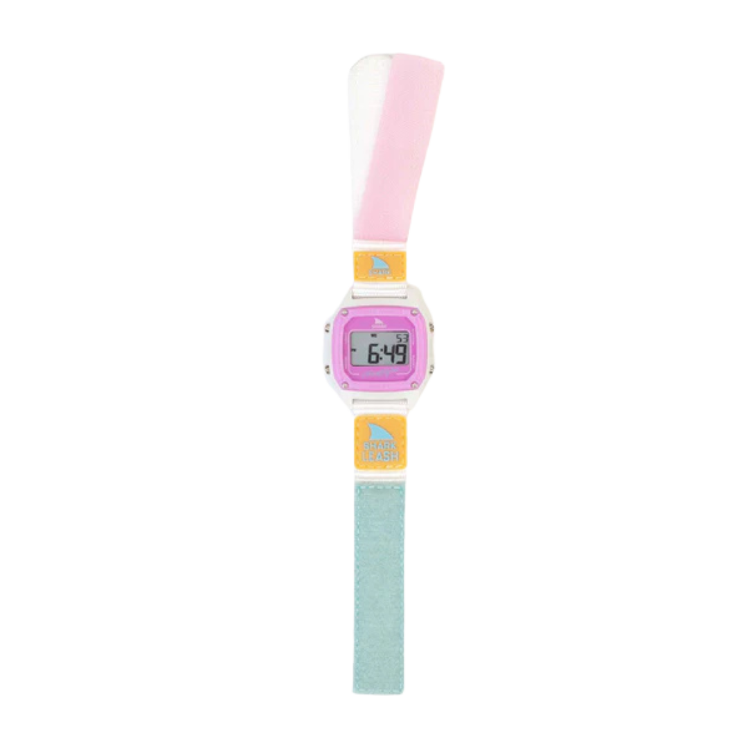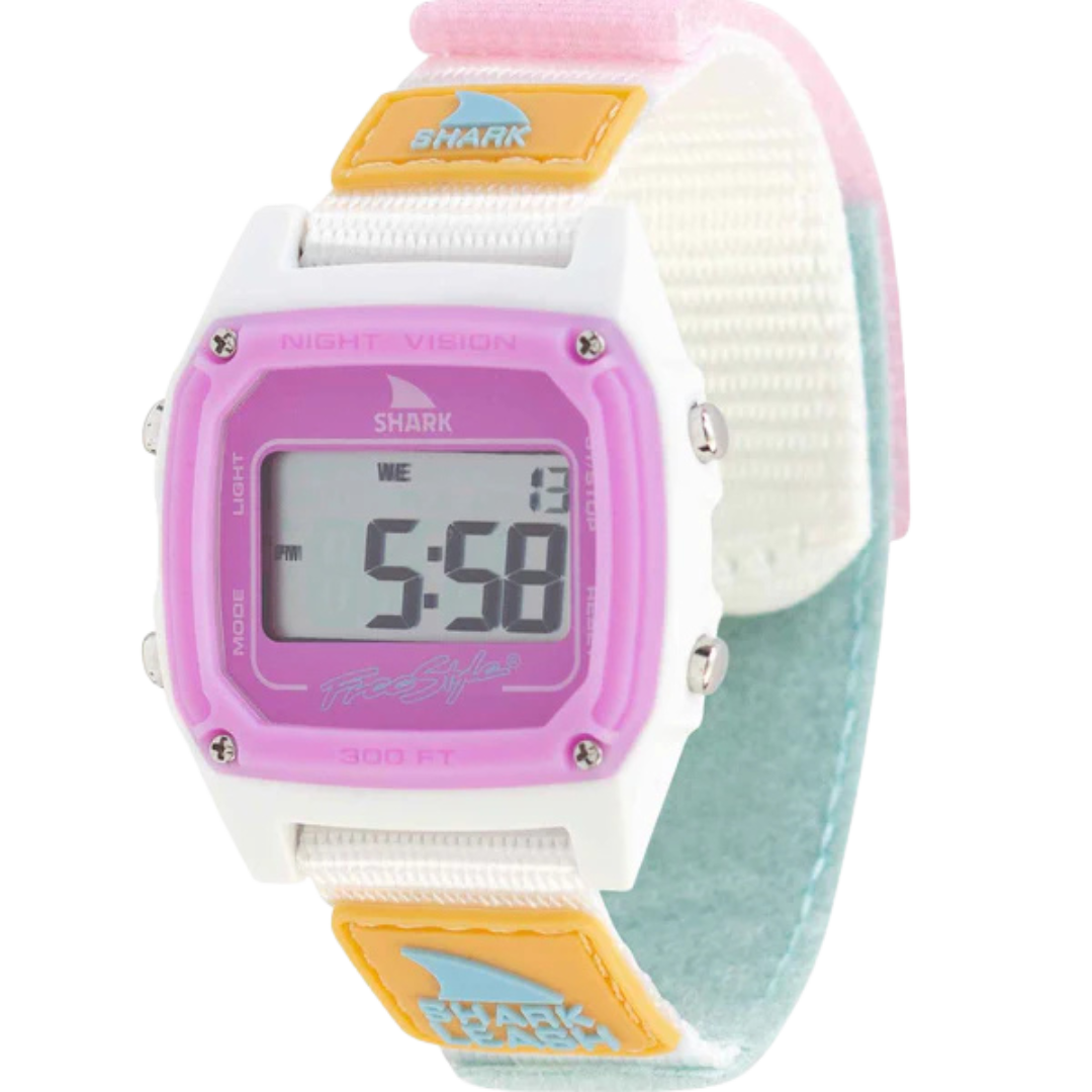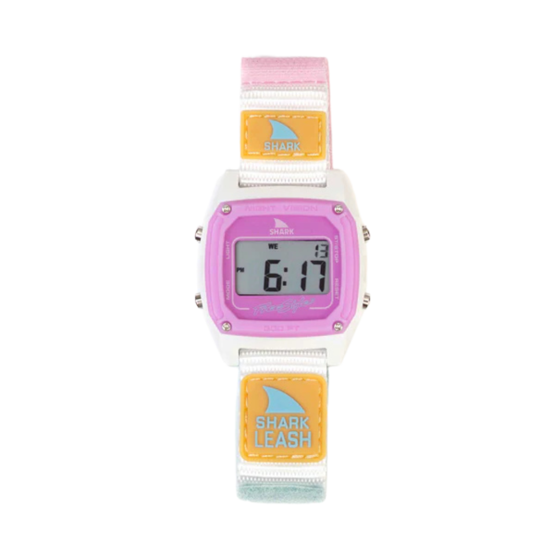They're Back. The original Leash band that ignited Freestyle Watches in the late '80s is back and better than ever. The shark leash's hook and loop closure system is modeled after an '80s style surfboard leash, and is ready to get radical. The Shark Leash comes loaded with standard digital features like time, date, stopwatch, countdown timer, alarm and night vision backlight. Like all Freestyle Watches, The Shark Leash is water resistant to 100 Meters and backed by our limited lifetime warranty. Shark to the Future!