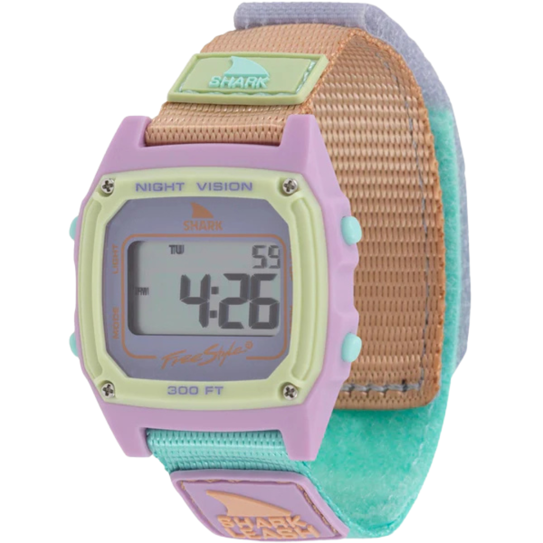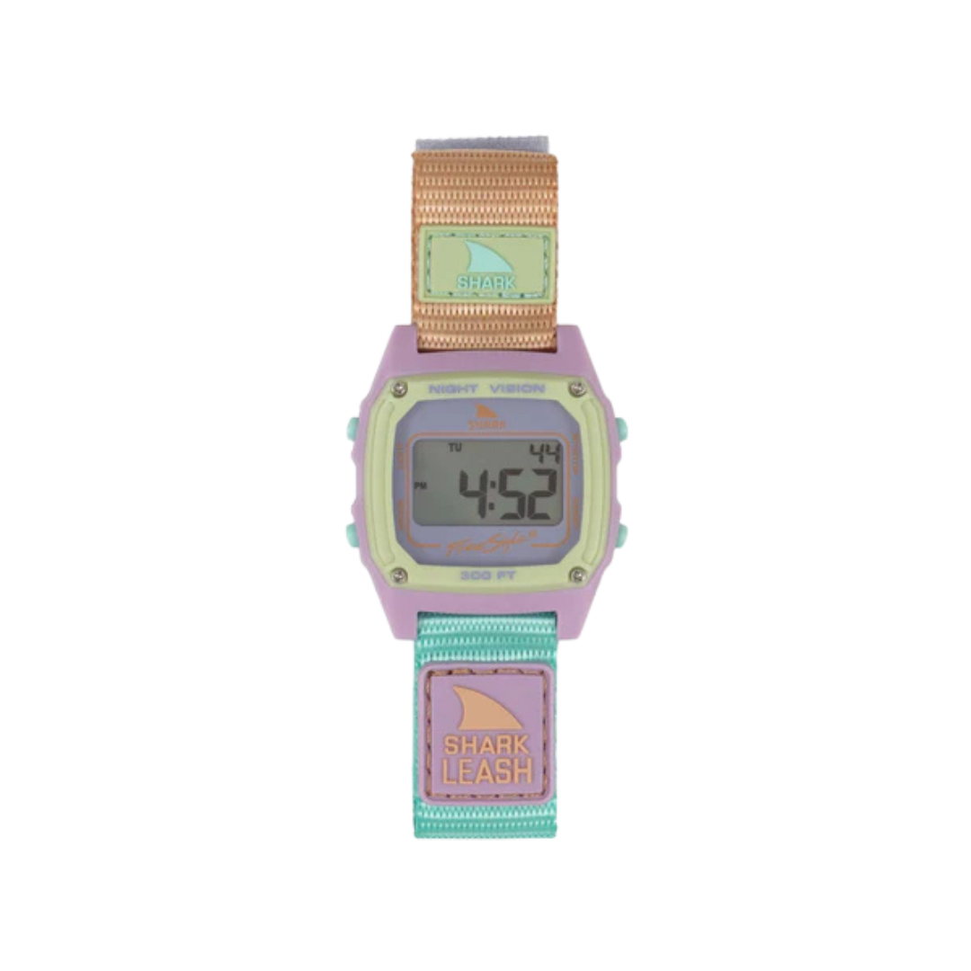 The Shark Leash Mint Pop blends a juicy mix of mint, lilac, and coral pastels for the perfect fall-meets-beach energy. Part of The Flavor Pack Collection, it keeps things light, bright, and always fun - like your favorite beach days that never seem to end. With Freestyle’s signature hook-and-loop closure for a secure fit, it’s got all the classic Freestyle digital watch features: 100M water resistance, night vision backlight, dual time, countdown timer, alarms, and a stopwatch.