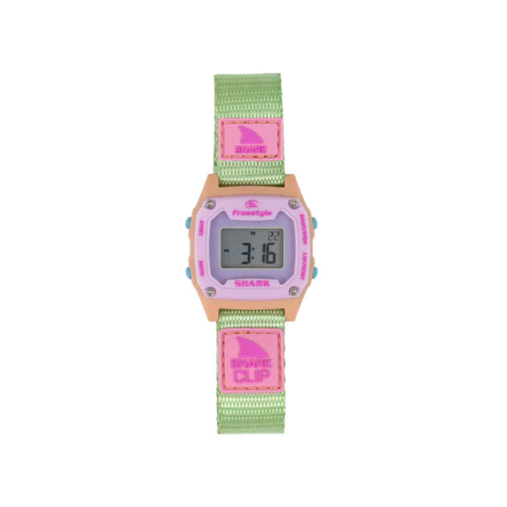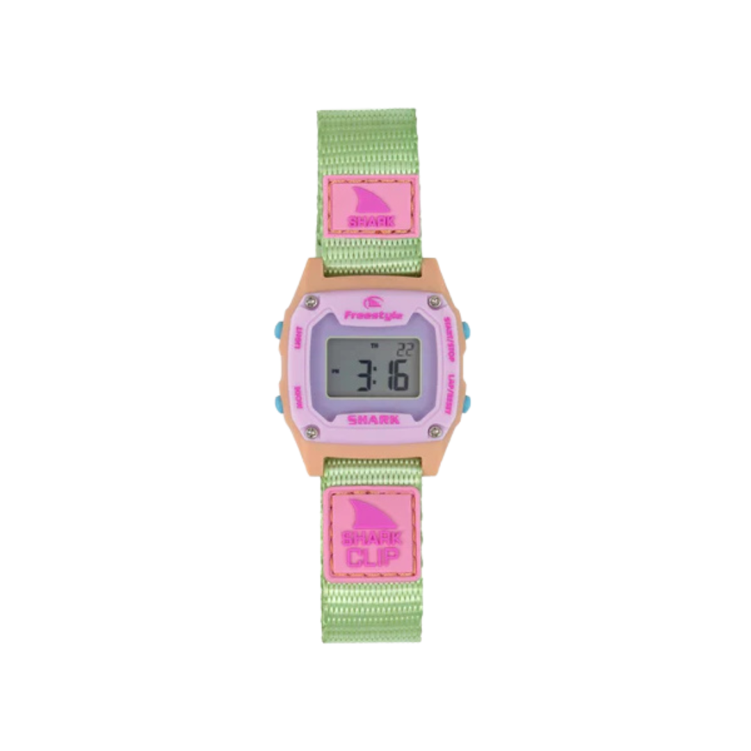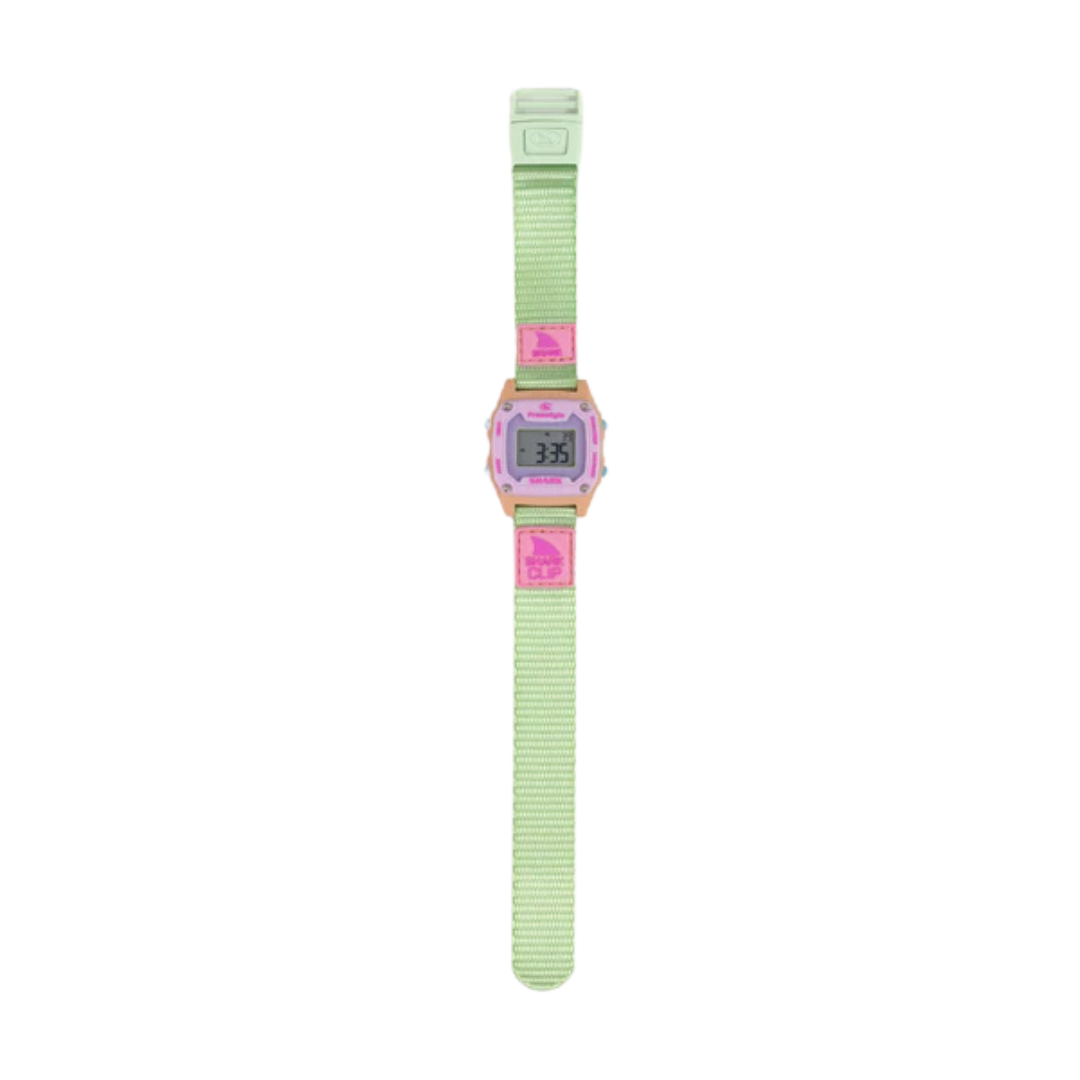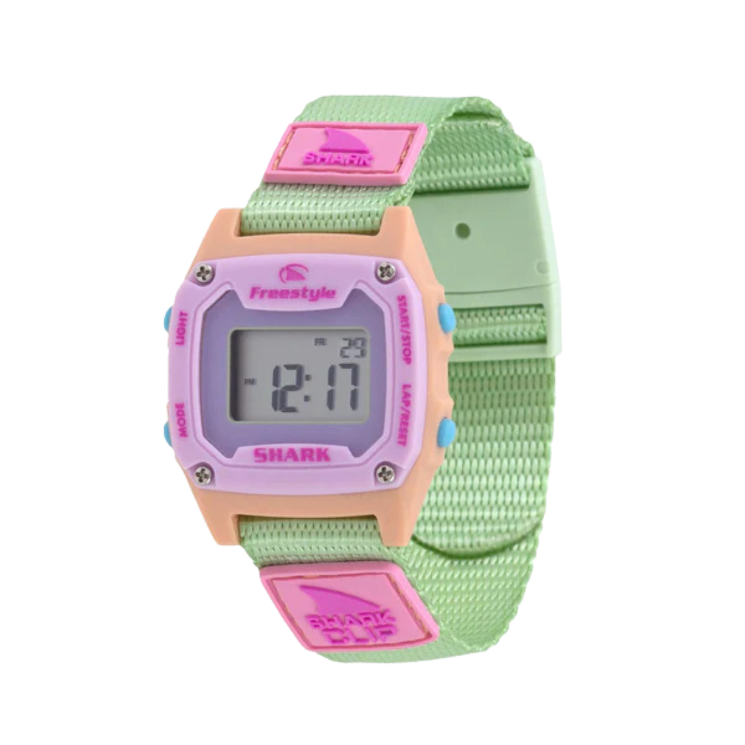 Shark Mini Citrus Twist serves up a swirl of pastel peach, soft lavender, and lime green in a color combo that feels like summer candy. This is the mini version of our original Citrus Twist - same retro digital watch design, same Freestyle features, just sized down - perfect for smaller wrists.